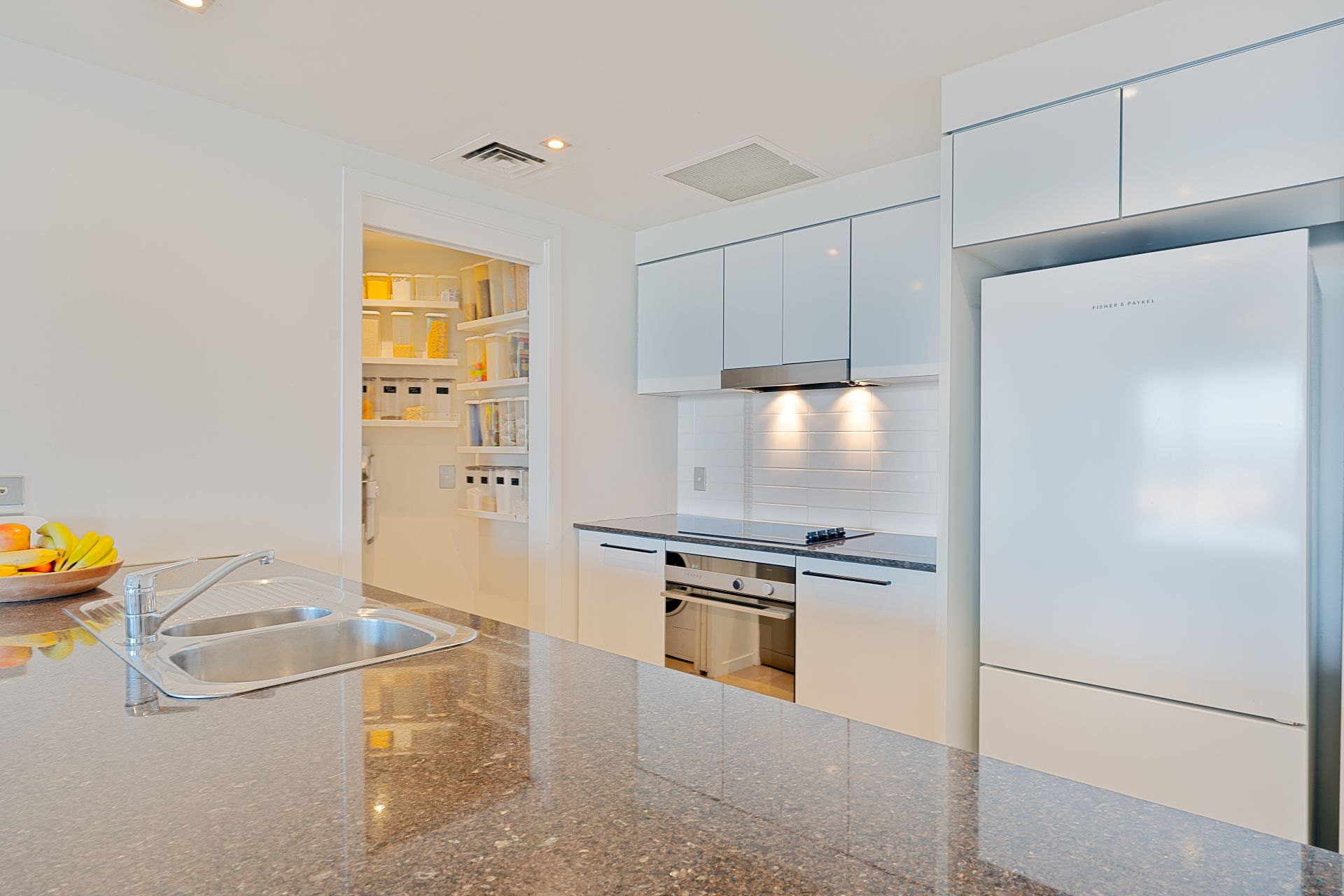 The kitchen is both practical and stylish, featuring ample bench space, a microwave nook, and electrical appliances, including dishwasher, oven, 4-burner cooktop, and range hood. Adjacent to the kitchen is a convenient laundry room with added shelving, ensuring seamless practicality.