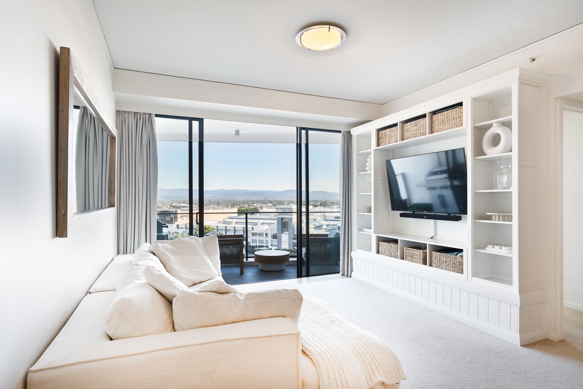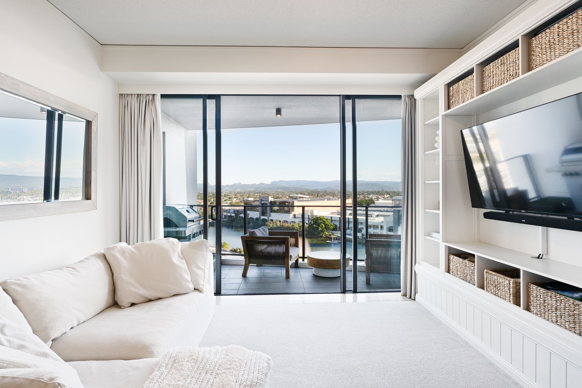 As you step inside, you’ll be greeted by an abundance of natural light that floods the space, highlighting the luxurious wool carpets and innovative storage solutions throughout. The open-plan kitchen, living and dining area is the heart of the home (ideal for entertaining) and seamlessly extends to a large balcony being a tranquil oasis where you can enjoy the captivating Gold Coast sunsets over the Hinterland. Savour the light sea breeze as you watch boats glide along the canals.