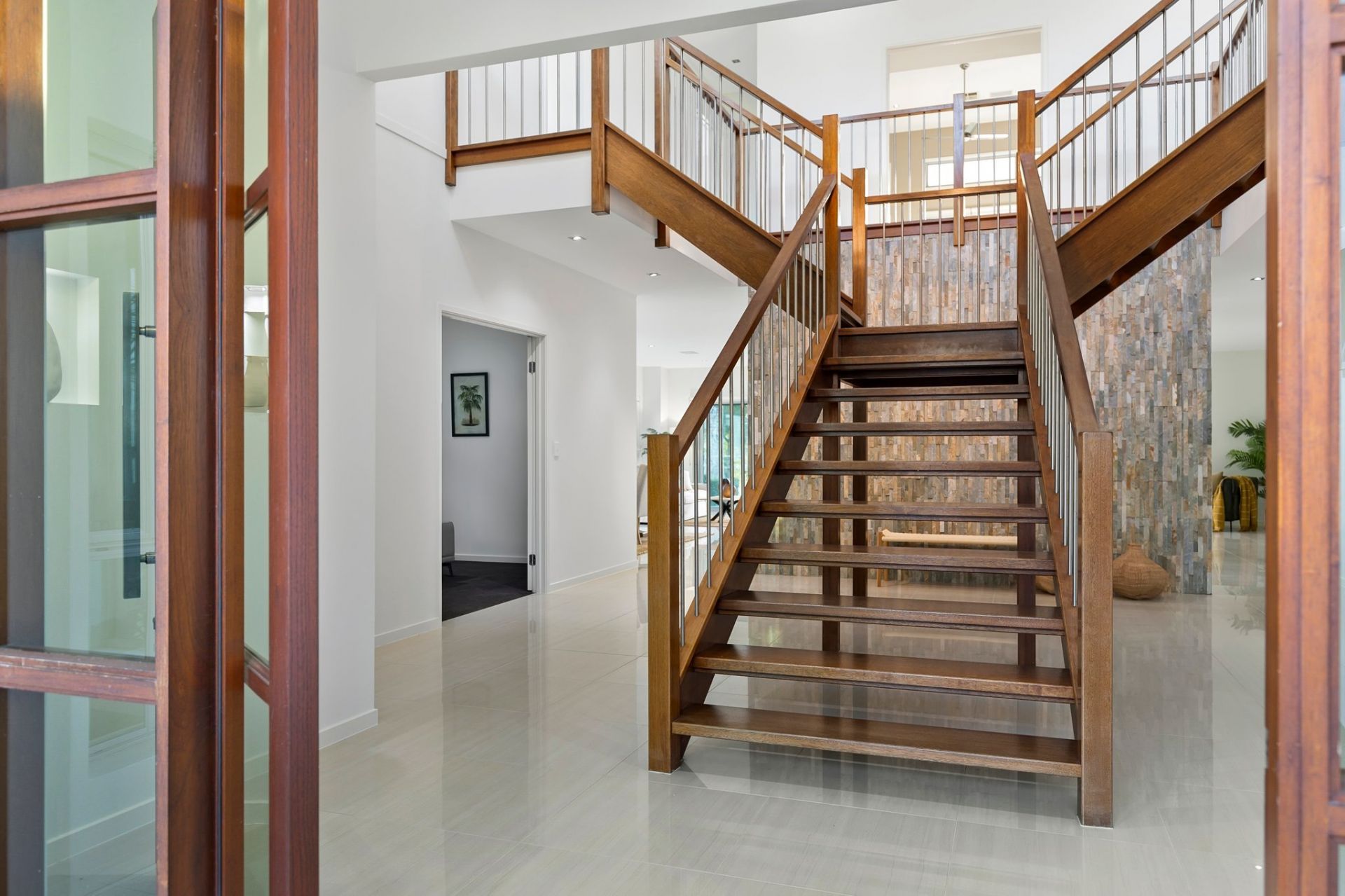 A striking entrance with a 6.7-meter ceiling, impressive timber staircase, and stone feature wall introduces this expansive home with standout features: