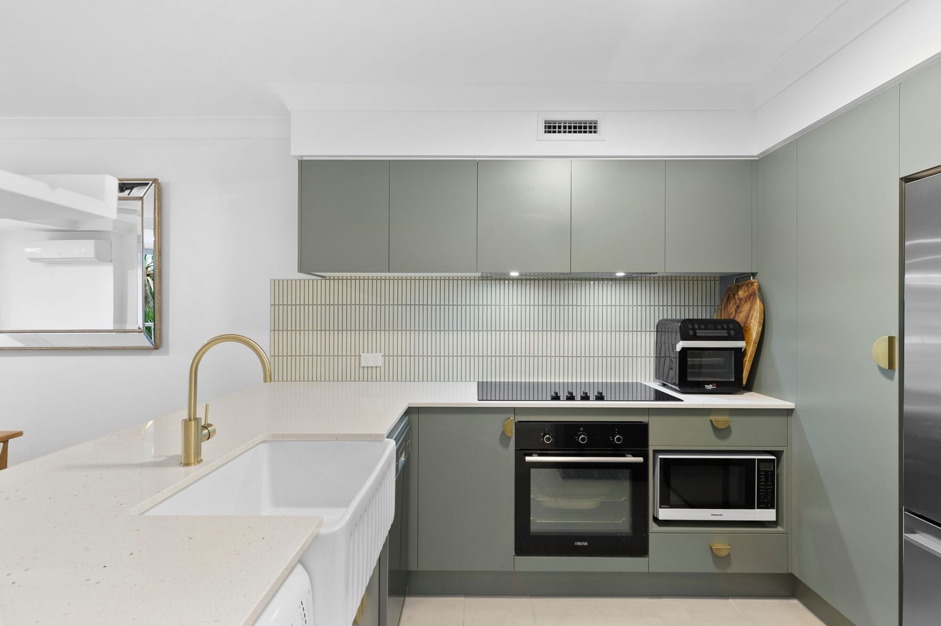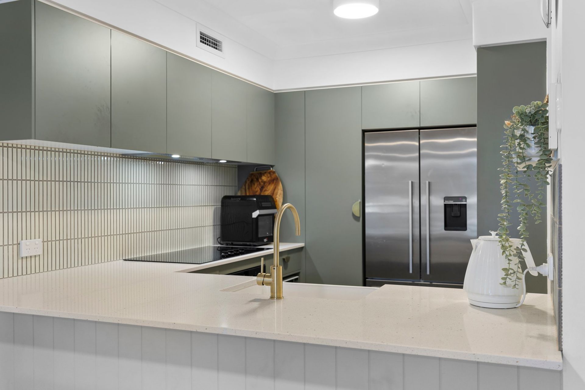 As you enter, you will immediately notice the stylish waterproof timber-look flooring flowing throughout the open living spaces, complemented by newly tiled floors in the kitchen and bathroom. The apartments professionally installed custom kitchen is a true standout, with premium cabinetry, brushed gold fixtures, fire clay farmhouse sink, 90cm cooktop, room for a double door fridge (professionally plumbed for water) and a layout that seamlessly blends functionality with a high-end aesthetic.