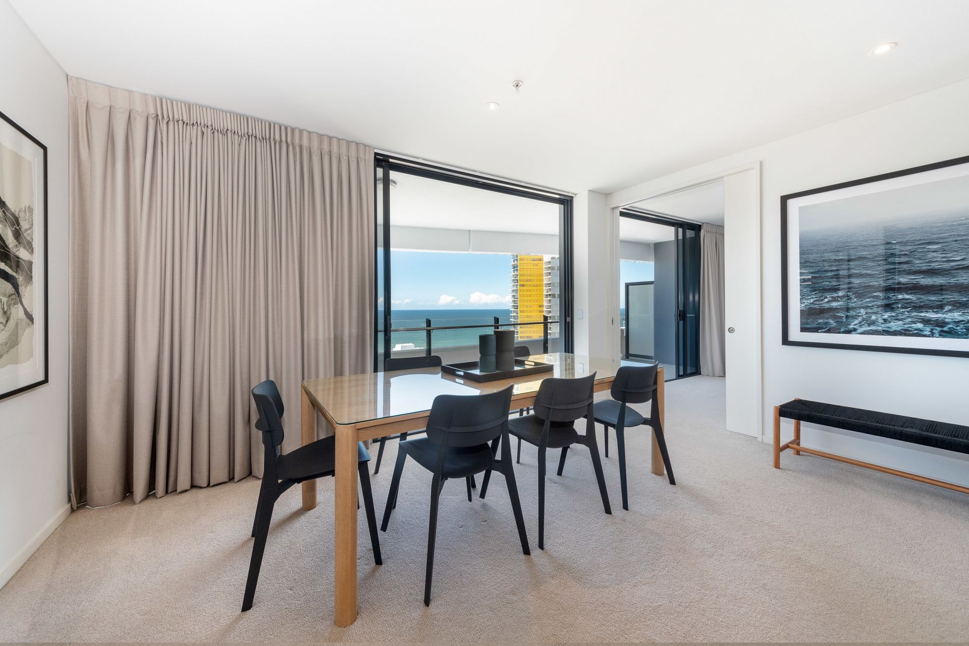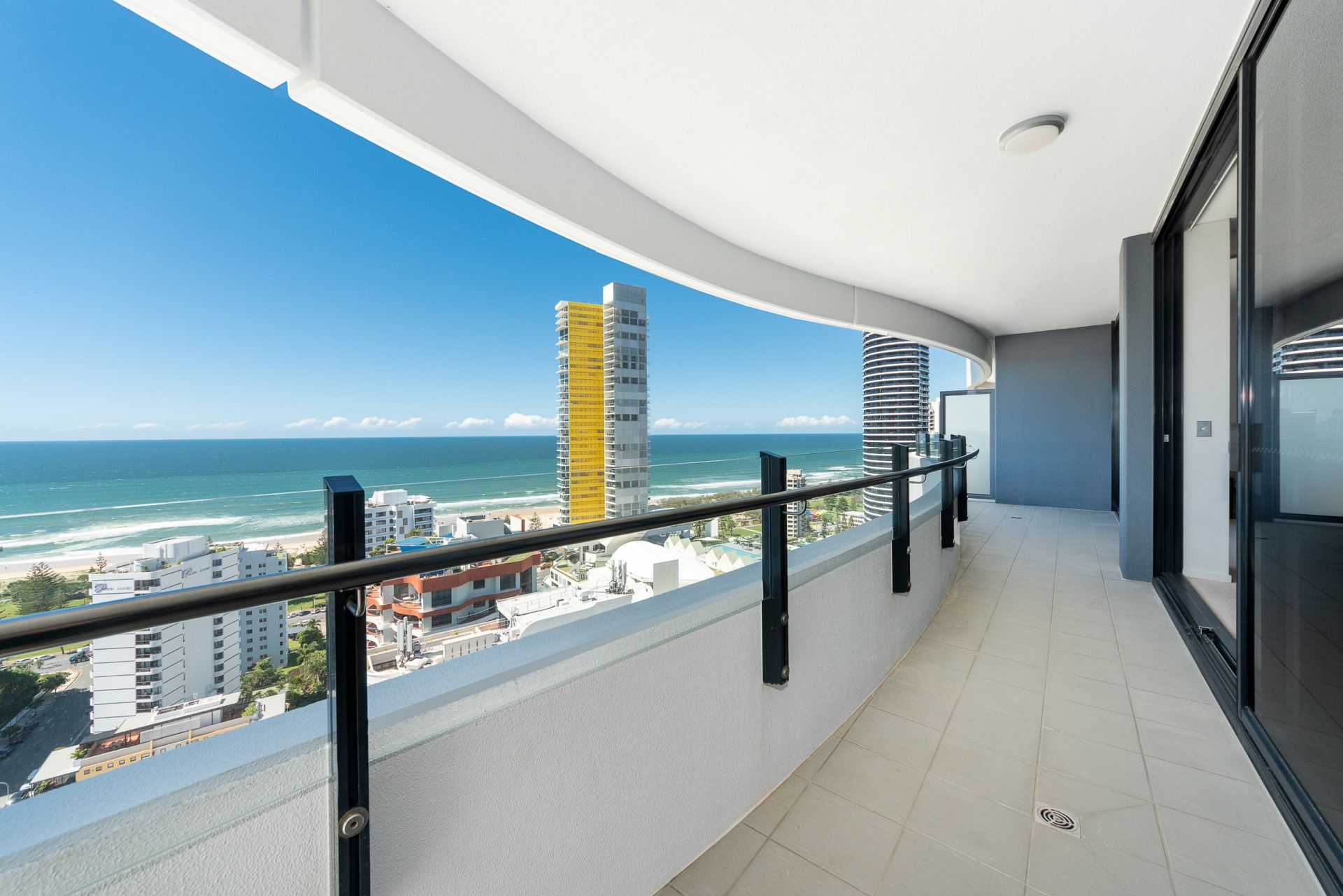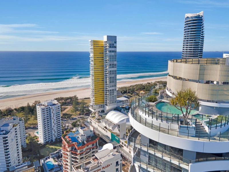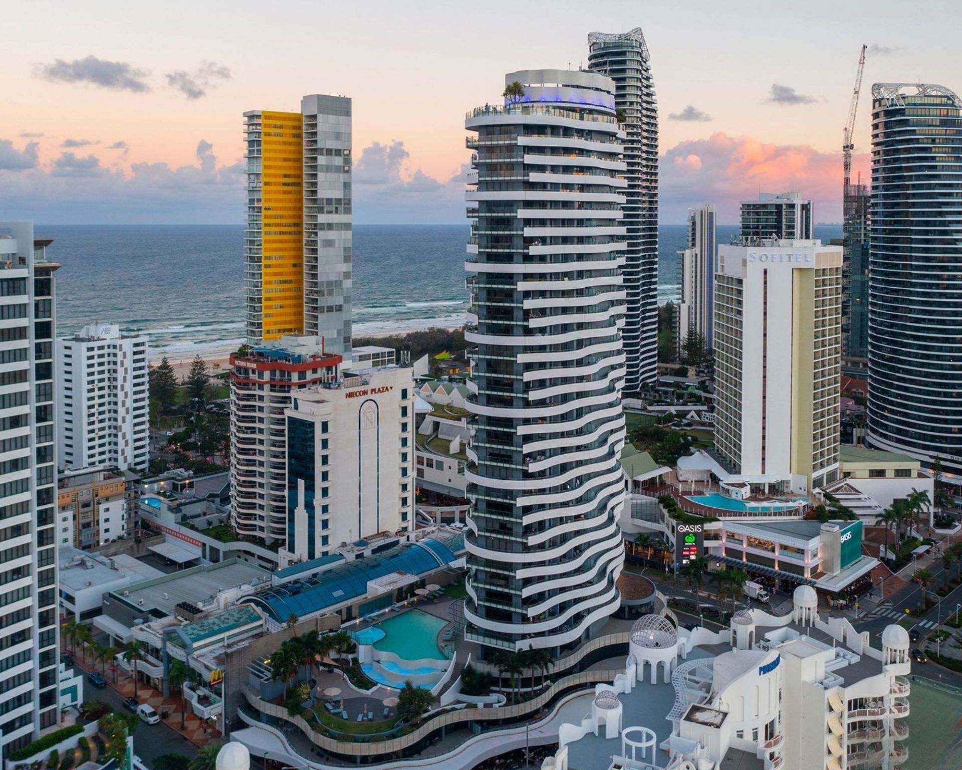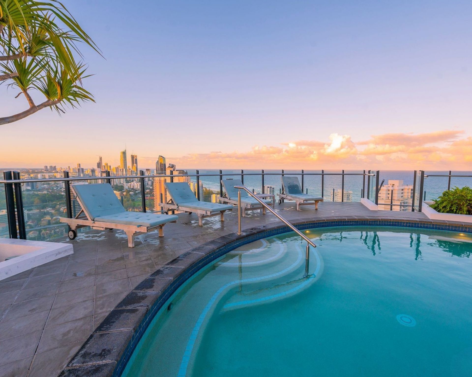 Roof top with views from Brisbane to NSW. Experience elevated coastal living at its finest in the iconic Wave – a multi-award-winning building celebrated for its wow factor facilities, striking design, premium build quality, and unbeatable lifestyle location. Positioned on level 23, elevated above the Niecon Plaza. This North East apartment offers panoramic vistas stretching from the ocean and protected Broadbeach Mall, capturing the best of both ocean views, and city sparkle.