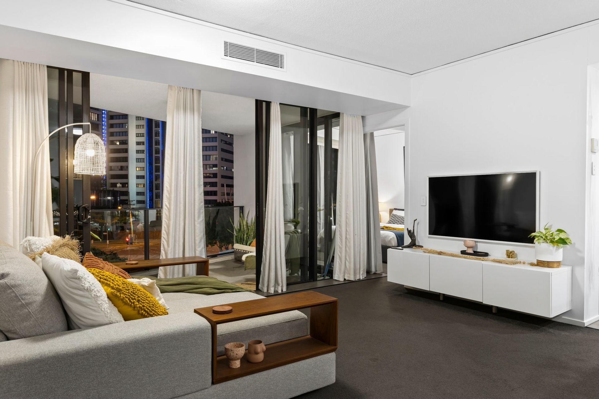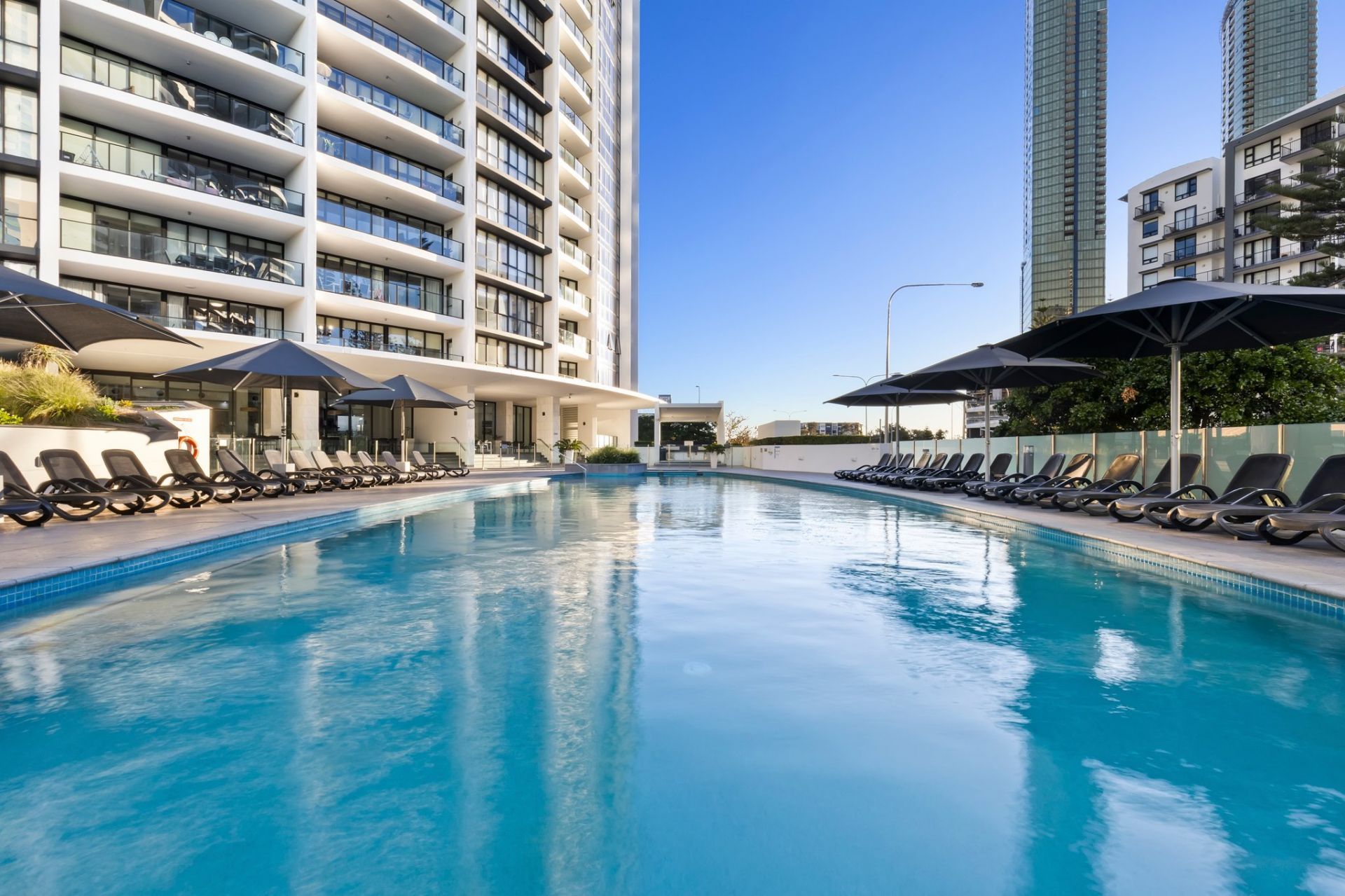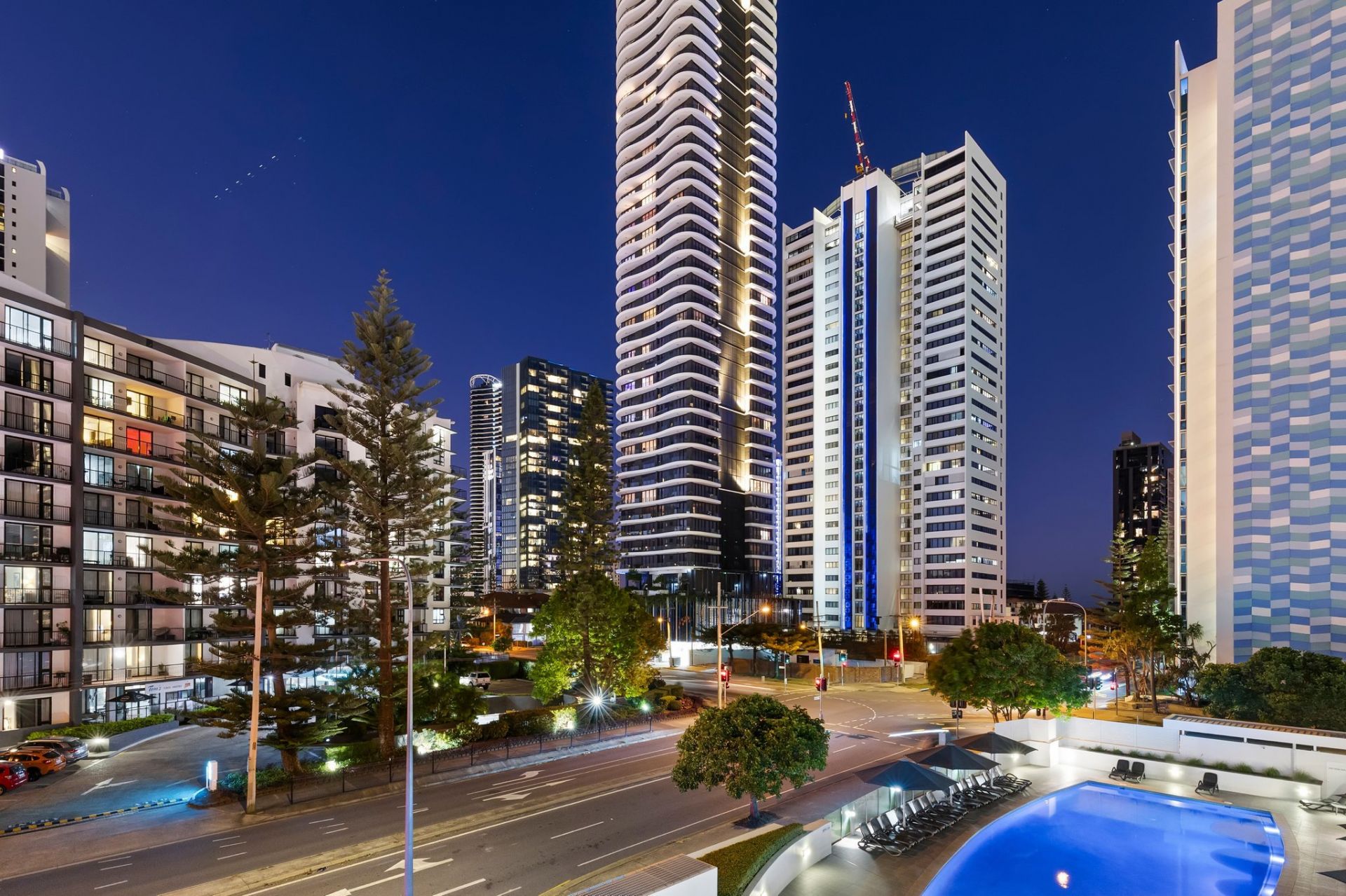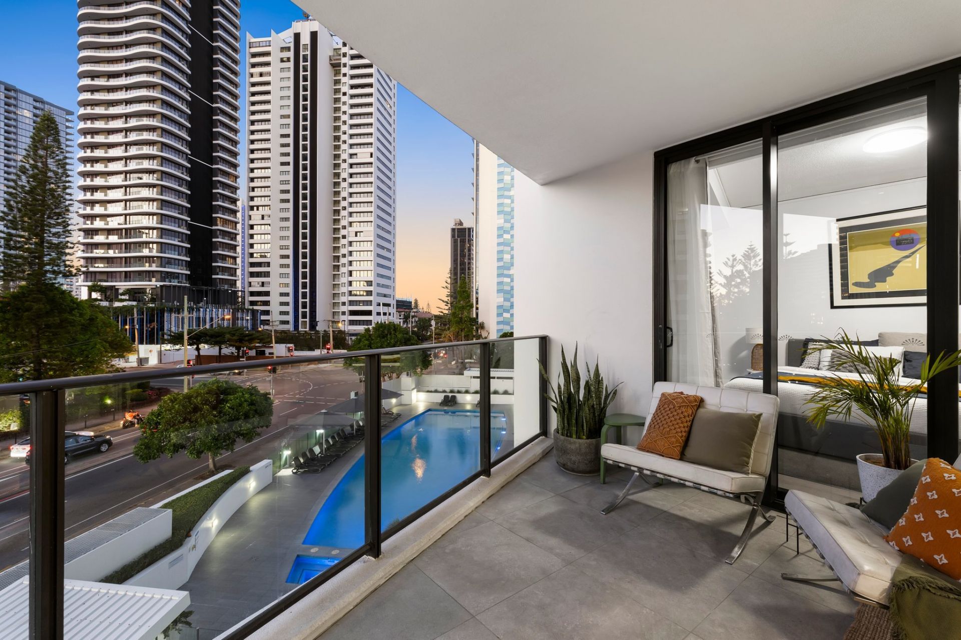 – Light-filled open plan living flowing onto a generous balcony with pool views and city lights