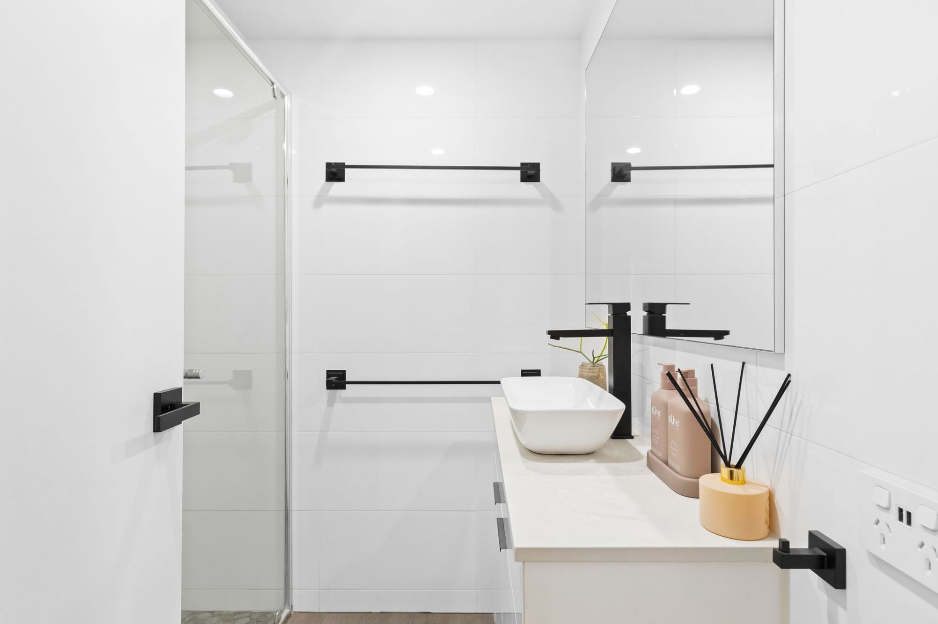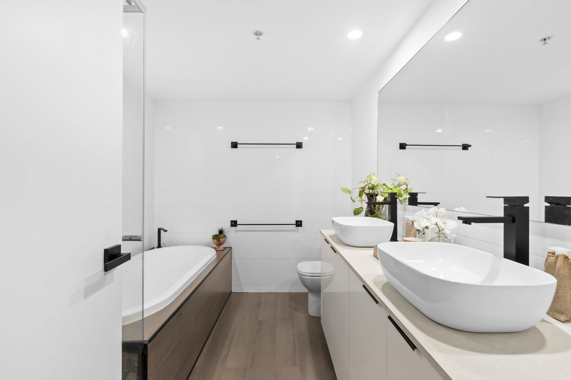 – Stunning bathrooms with timber-look tile, stone benchtops and black fittings
