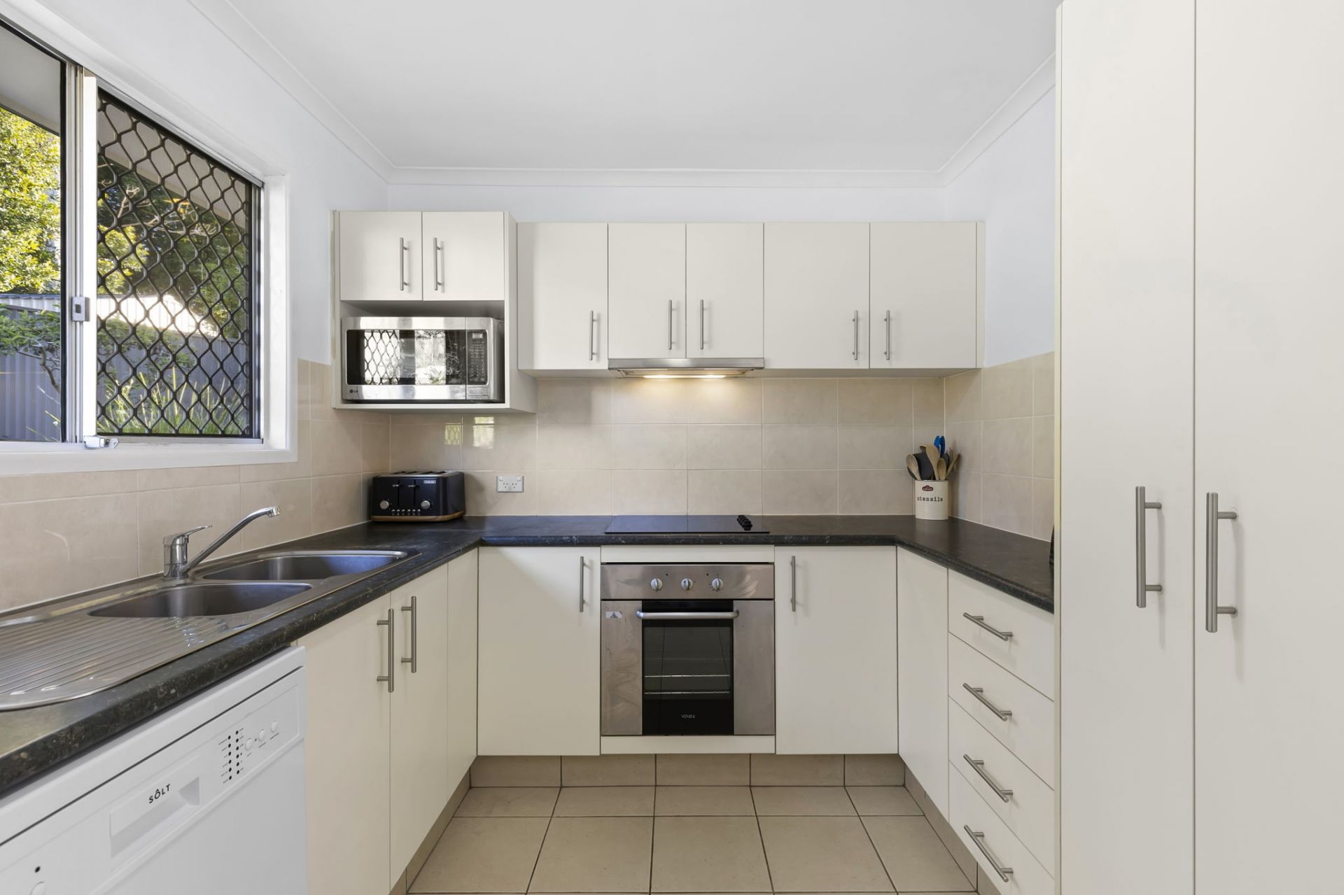 * Neat and functional kitchen with a leafy backyard outlook.