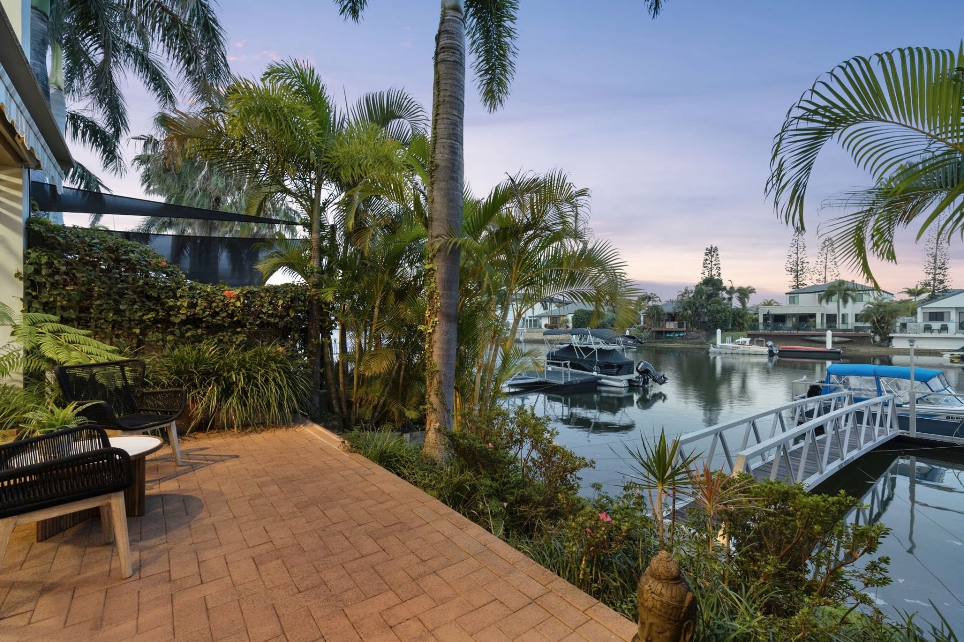 – Tropical waterfront courtyard for private relaxation and entertaining.