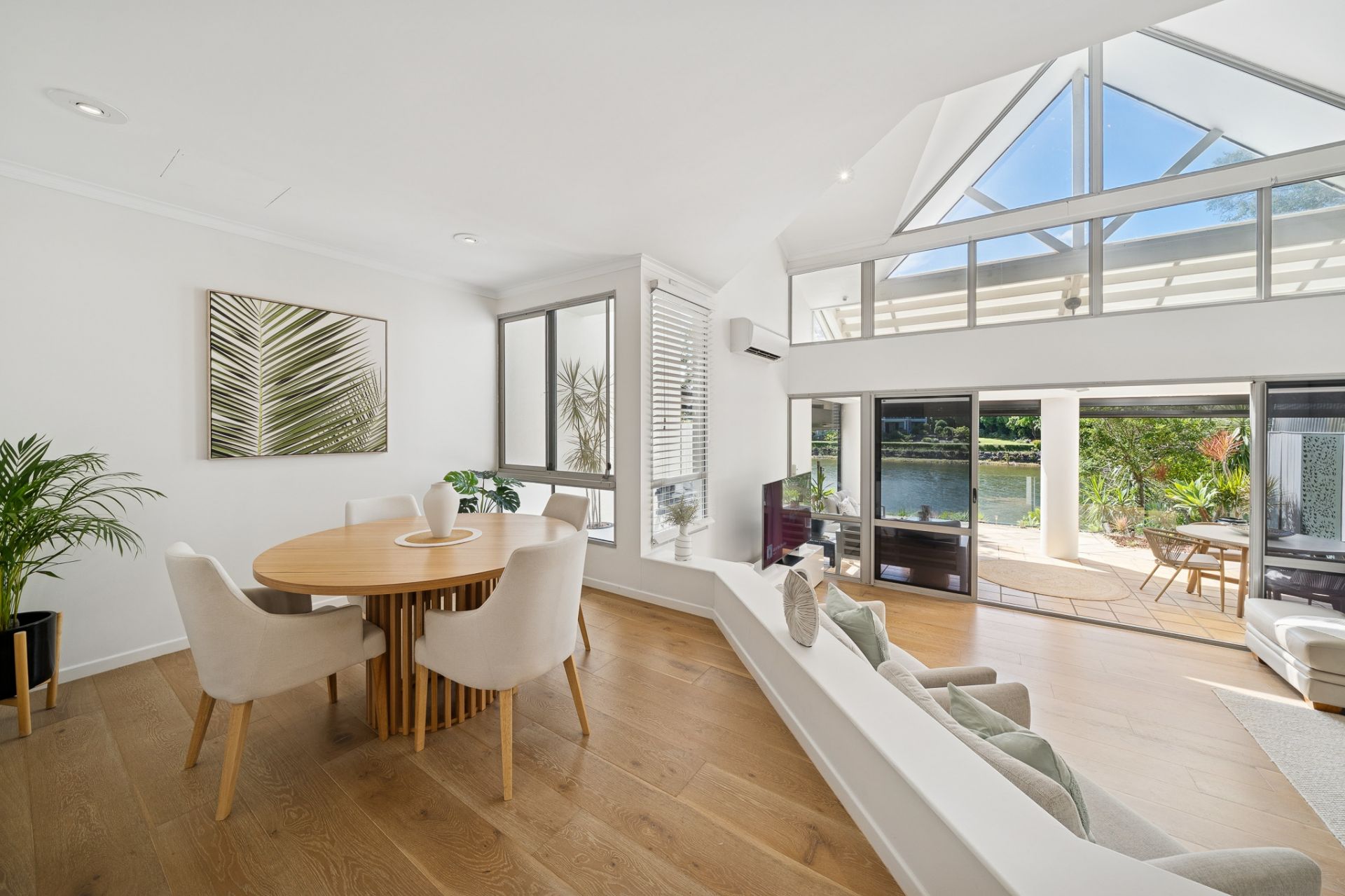The sunken living and dining areas with timber flooring flow seamlessly to a large, covered, protected sunny alfresco terrace with all-weather blinds and screens. Watch the boating activity gently float by under a speed-limit-controlled waterway, along with an abundance of birdlife, stunning sunsets and cooling water breezes, all overlooking landscaped, fenced tropical gardens that lead directly to the tidal canal and sandy beach – a truly rare offering. This sanctuary is located at number 2 in the “Carolina” Stage 1 section of the estate. Each section contains only a small number of townhouses, creating boutique, private living enclaves.
