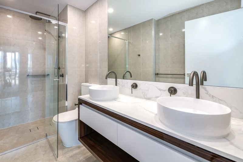 * Sleek stone bench tops throughout kitchen and bathrooms